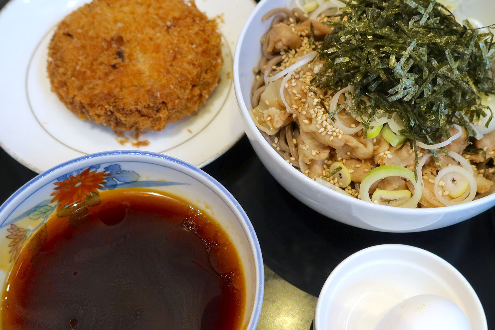 羽田空港第二ターミナル「The Minatoya Lounge」で港屋の冷たい肉そば&メンチセット