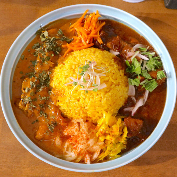 Aカレー「濃厚鶏だしとココナッツ仕上げまろやかチキンカレー」とBカレー「県産麦酒と黒糖でじっくり煮込んだ柔らかポークカレー」の二盛カレーをいただきました。ご飯の量は250g、辛さは5倍です。